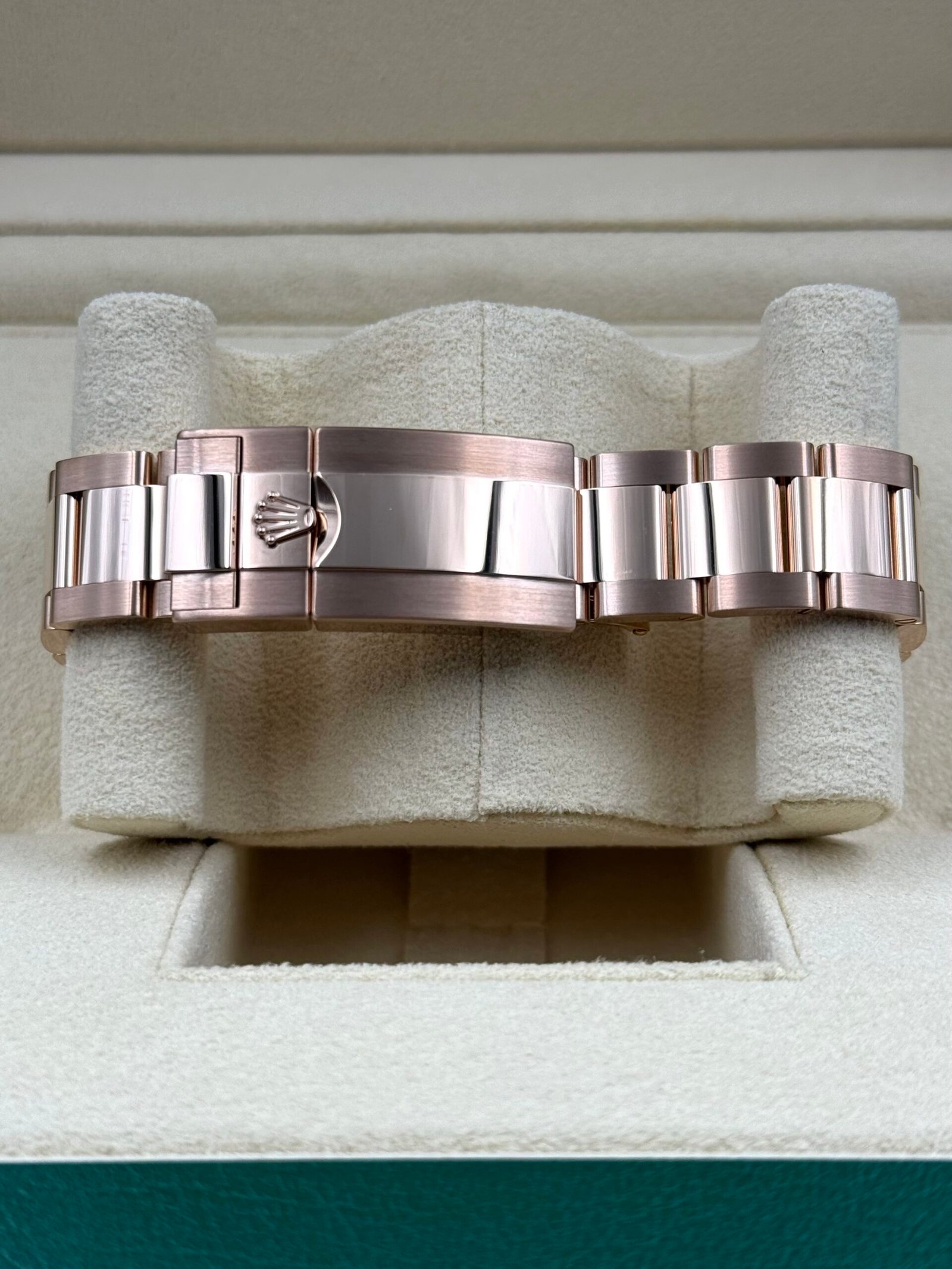 The watch is fitted with the iconic Oyster bracelet, crafted from solid 18k Everose gold. The Oyster bracelet is designed for both comfort and durability, featuring a combination of polished and brushed finishes that enhance the watch’s luxurious appearance. It is equipped with an Oysterlock folding safety clasp and the Easylink 5mm comfort extension link, allowing for quick adjustments to ensure a perfect fit.