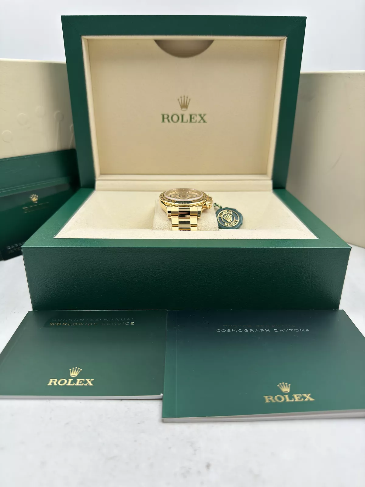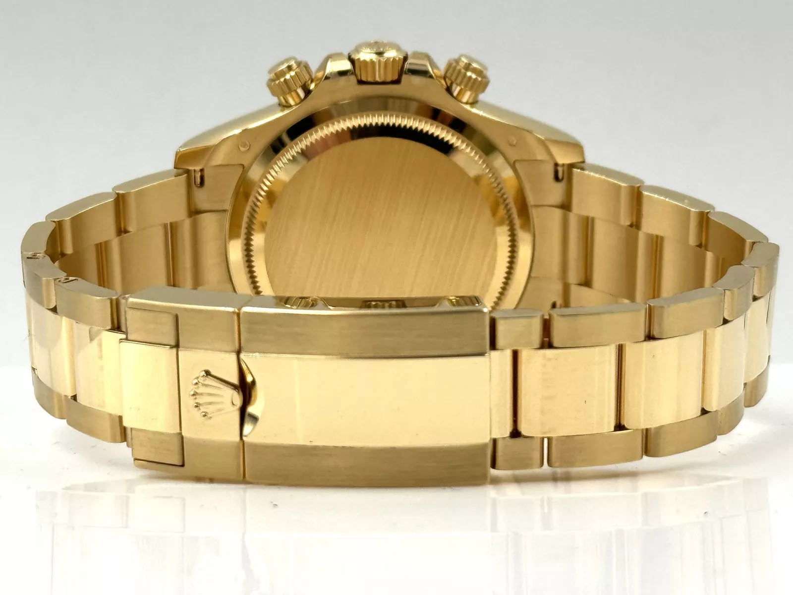 The 40mm case is crafted entirely from 18k yellow gold, giving the watch a striking presence on the wrist. Its polished finish and classic proportions reflect the Daytona’s origins as a racing chronograph while adding a touch of opulence. The fixed yellow gold bezel features an engraved tachymeter scale, allowing wearers to measure speeds up to 400 units per hour—a nod to the Daytona’s racing legacy.