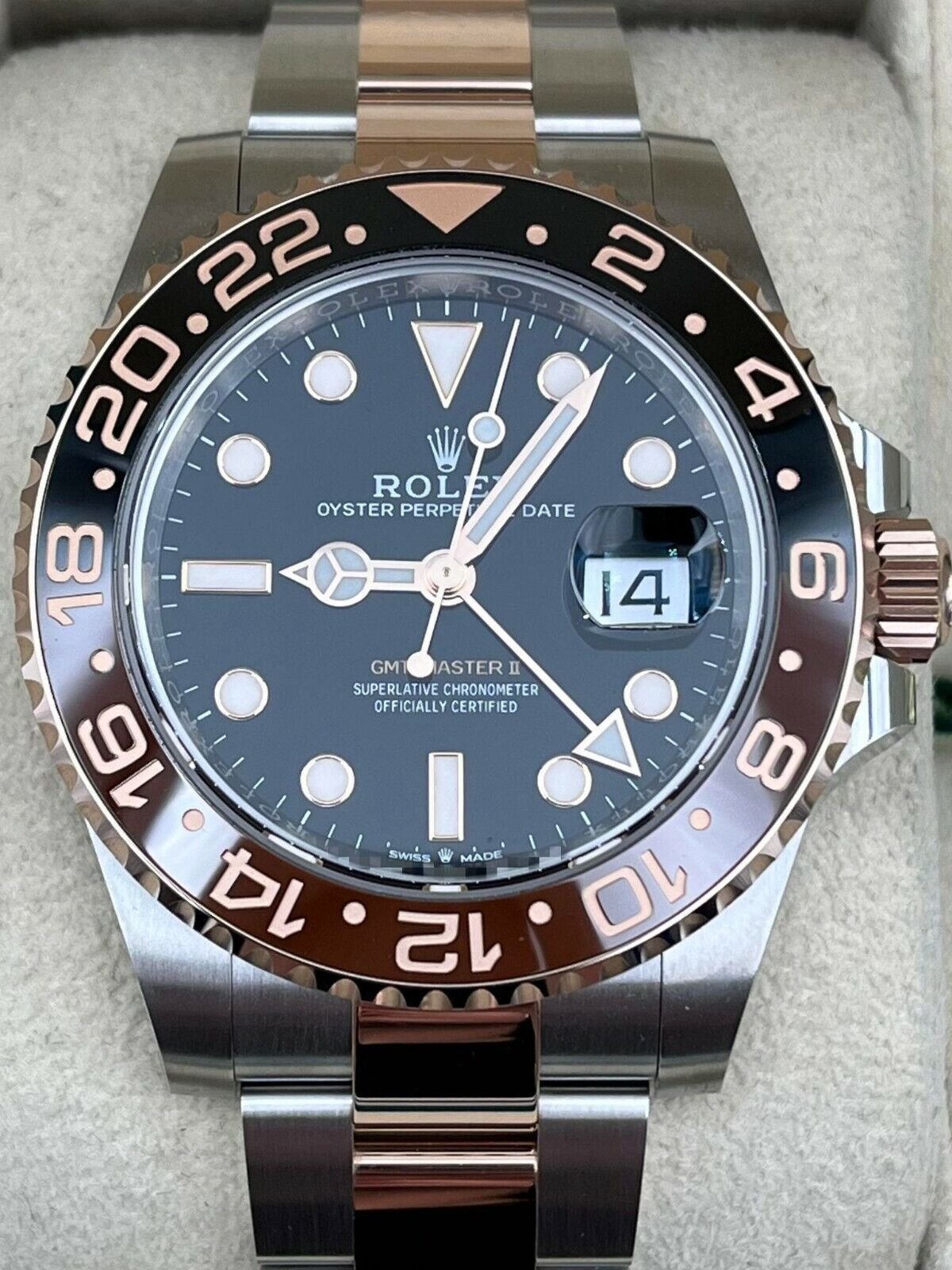 Introducing the Rolex GMT Master II 126711CHNR (Year: 2024) – a testament to timeless design and precision. This piece features a oyster dial, two tone rose gold/stainless steel bracelet, and Black steel case, making it a statement piece that effortlessly captures attention.