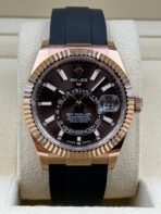 The Rolex Sky-Dweller Ref. 336235 is a captivating timepiece that blends sophisticated design with innovative functionality. This Rolex offers a robust build and a complication ideal for globetrotters, making it a coveted choice for watch enthusiasts who appreciate a blend of luxury and utility. The 18k Everose gold case and Oysterflex bracelet combine timeless elegance with modern comfort, while the chocolate brown dial adds a touch of warmth.